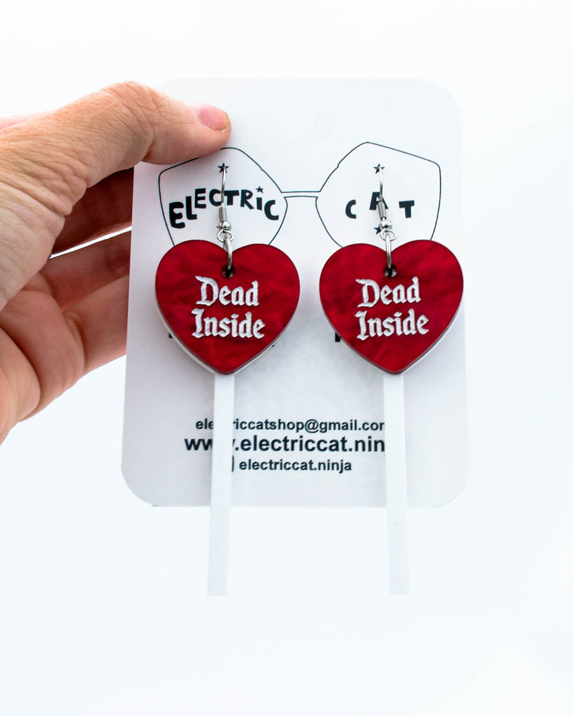 These heart-shaped lollipop earrings mix candy-cute with a perfect dose of existential sass. Laser cut from glossy acrylic and engraved with the words Dead Inside, they’re made for anyone whose vibe is equal parts adorable and unbothered.