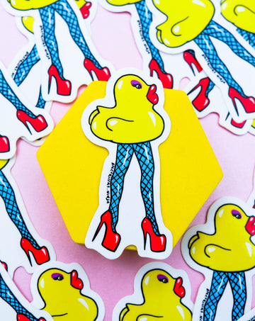 Serving duck, diva, and drama. This fierce sticker features a sassy rubber duck rocking fishnets and sky-high red heels—perfect for anyone who lives for absurd glam and unapologetic flair. A hilarious and bold gift idea for birthdays, Christmas, Halloween, or just because. Handmade in the USA, this vinyl sticker is ready to slay on laptops, water bottles, journals, and beyond.