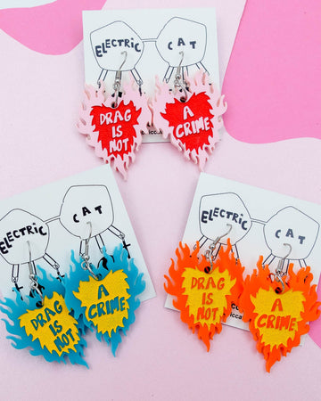 Acrylic "Drag Is Not A Crime" earrings.