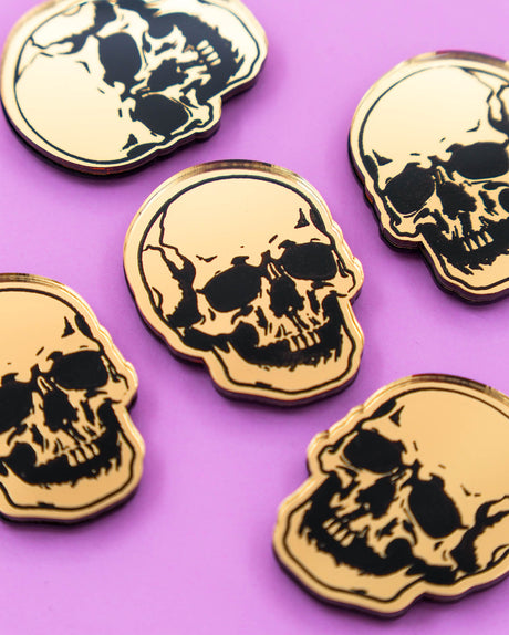 Approximately 2" gold mirror acrylic skull magnet.